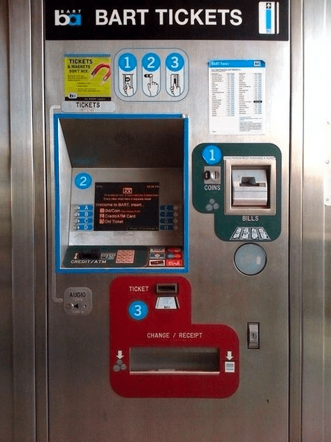 From left to right, both first and second machines are using numbers (1)(2)(3) to guide people. The first one uses strong colors and numbers on three sections, creating a clear process flow. The second kiosk aligns the numbers vertically and uses different blue to distinguish three parts, which is a successfull process flow, too. The last kiosk's manipulating area basically as same as the one I am redesigning. However, it's top information is quite easy to understand, big numbers and clear flow.